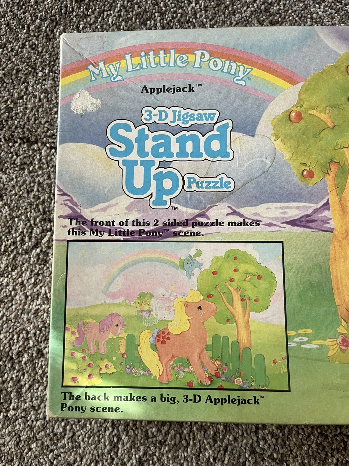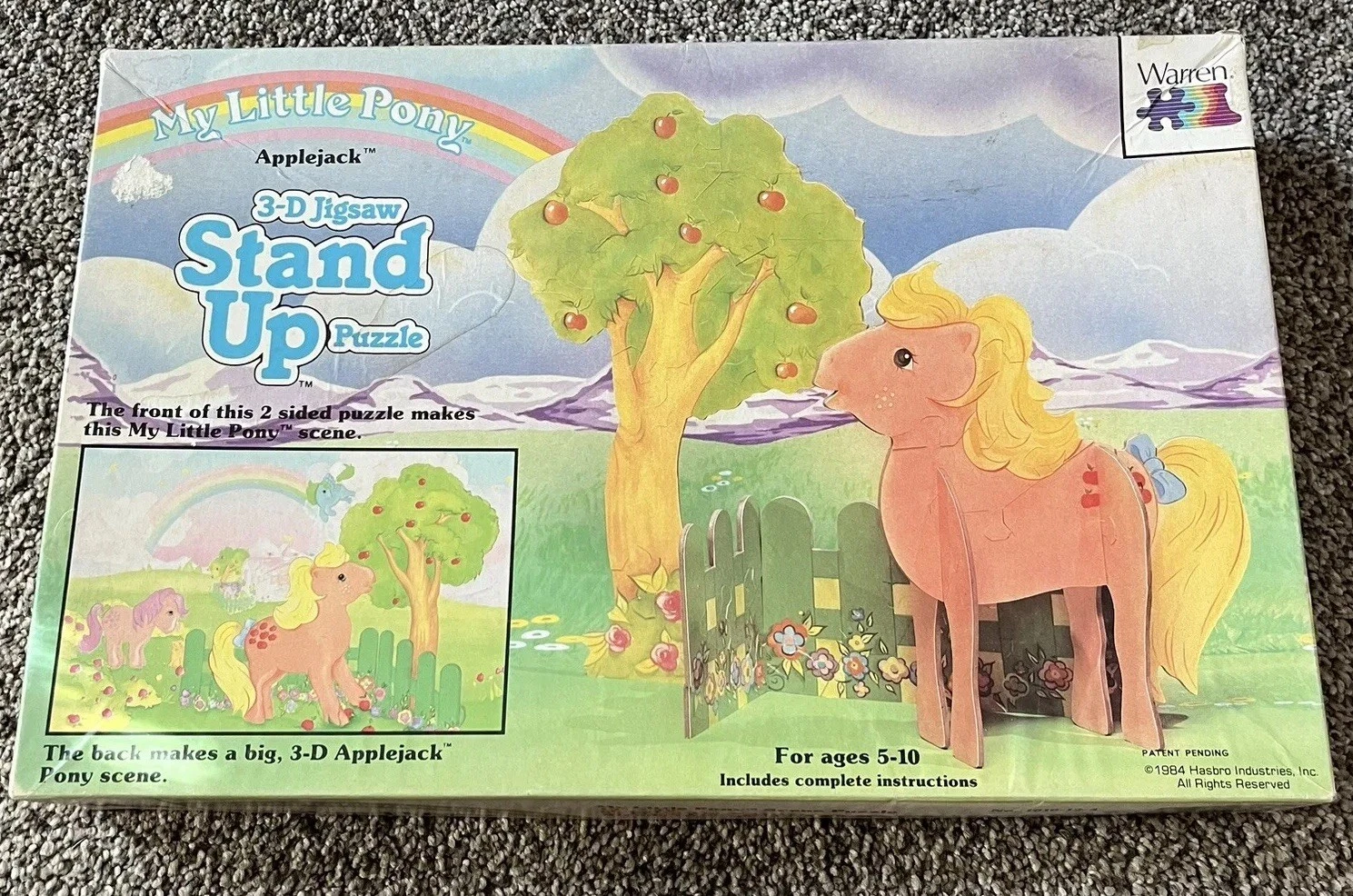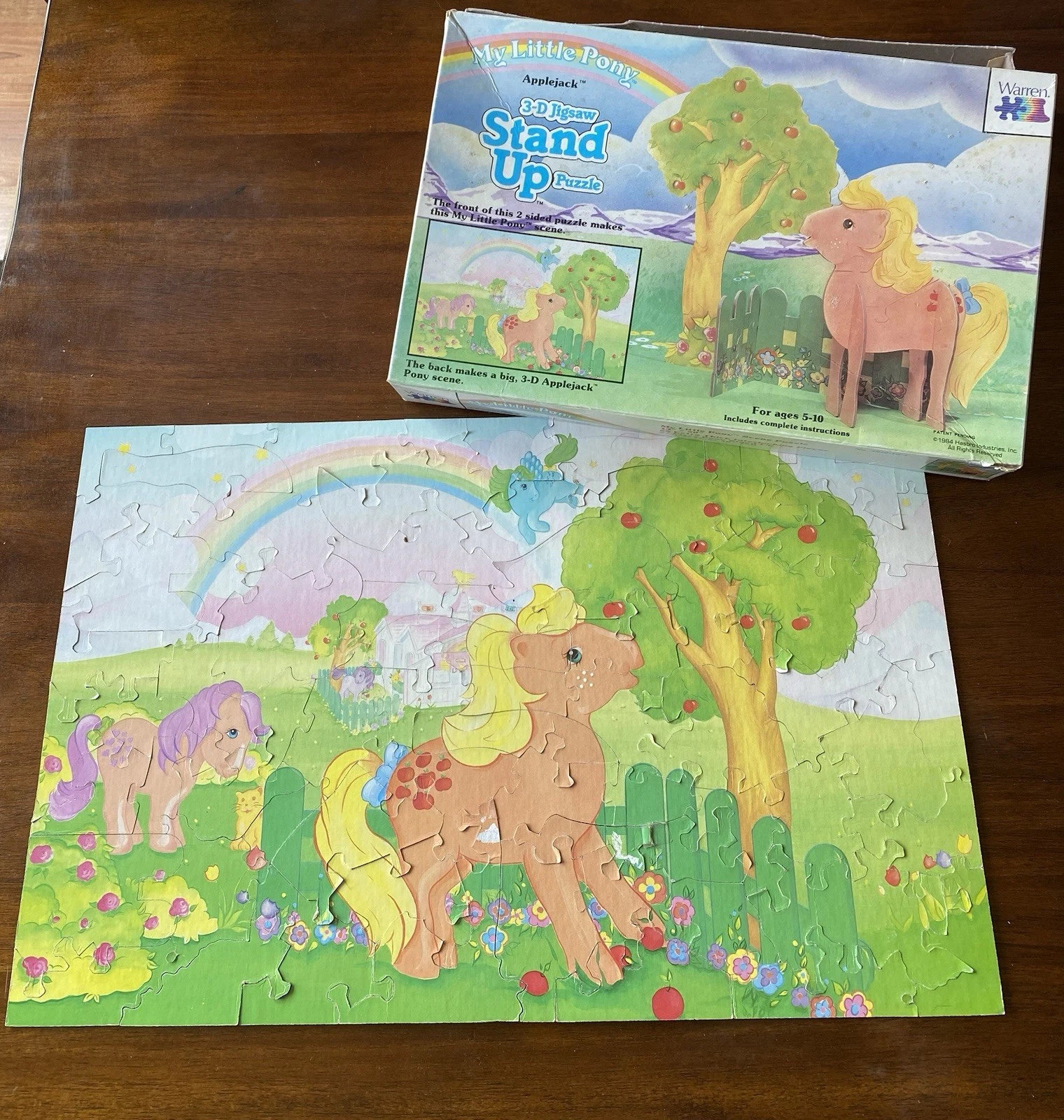 The puzzle focuses on Applejack, but Medley, Peachy, Blossom, and Twinkles are in the background. The Show Stable is featured