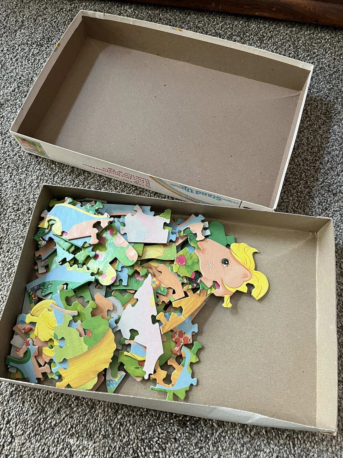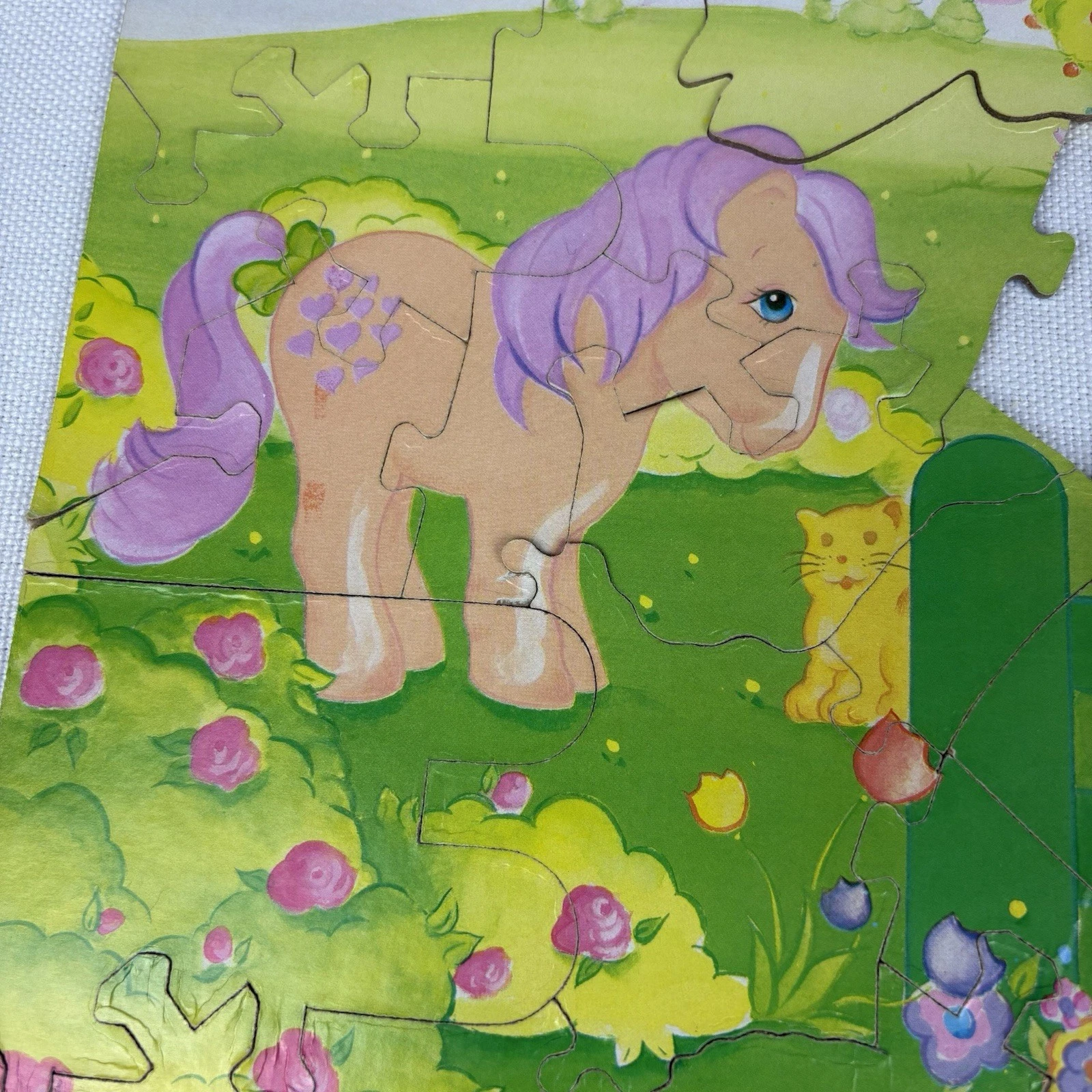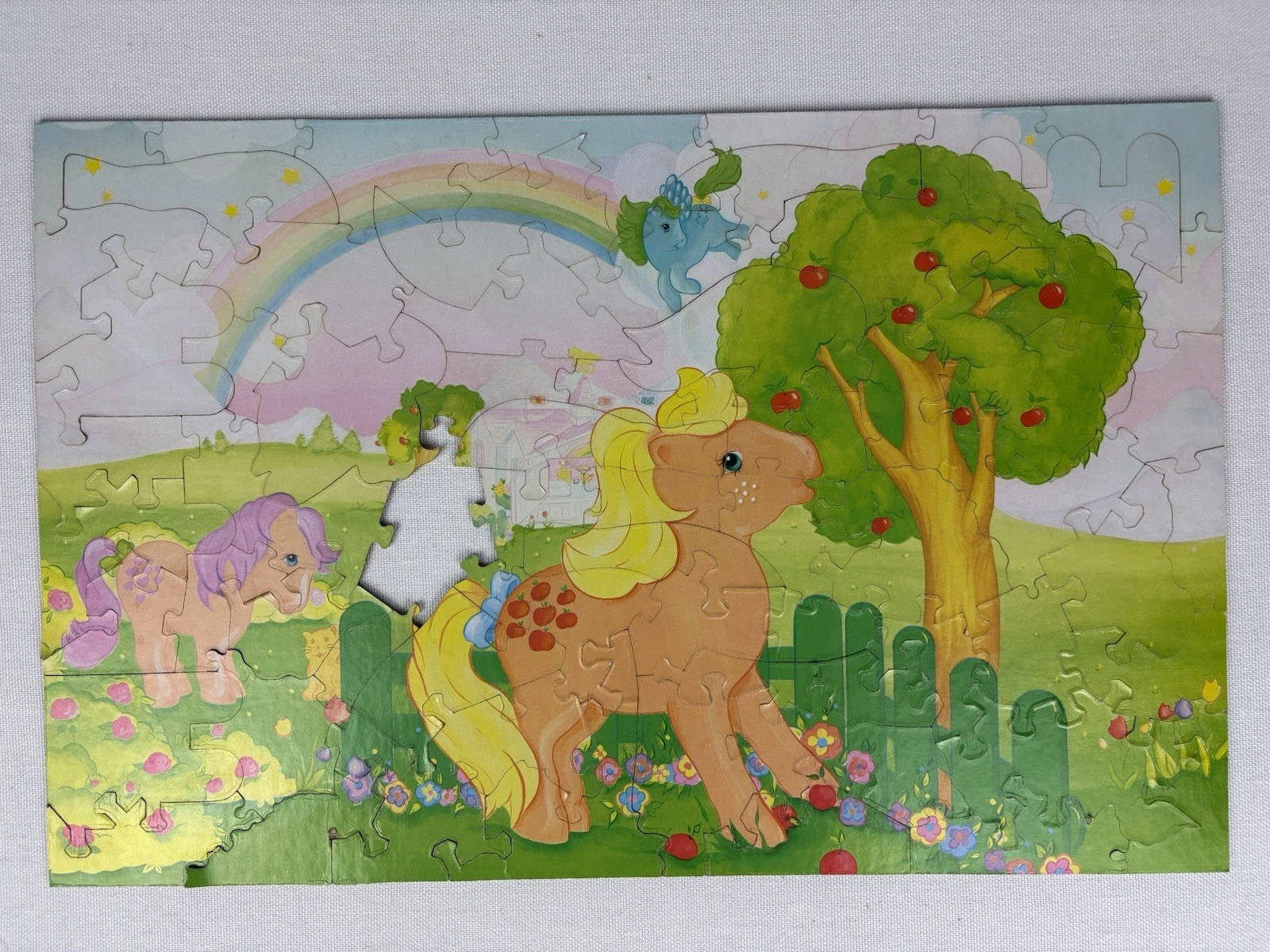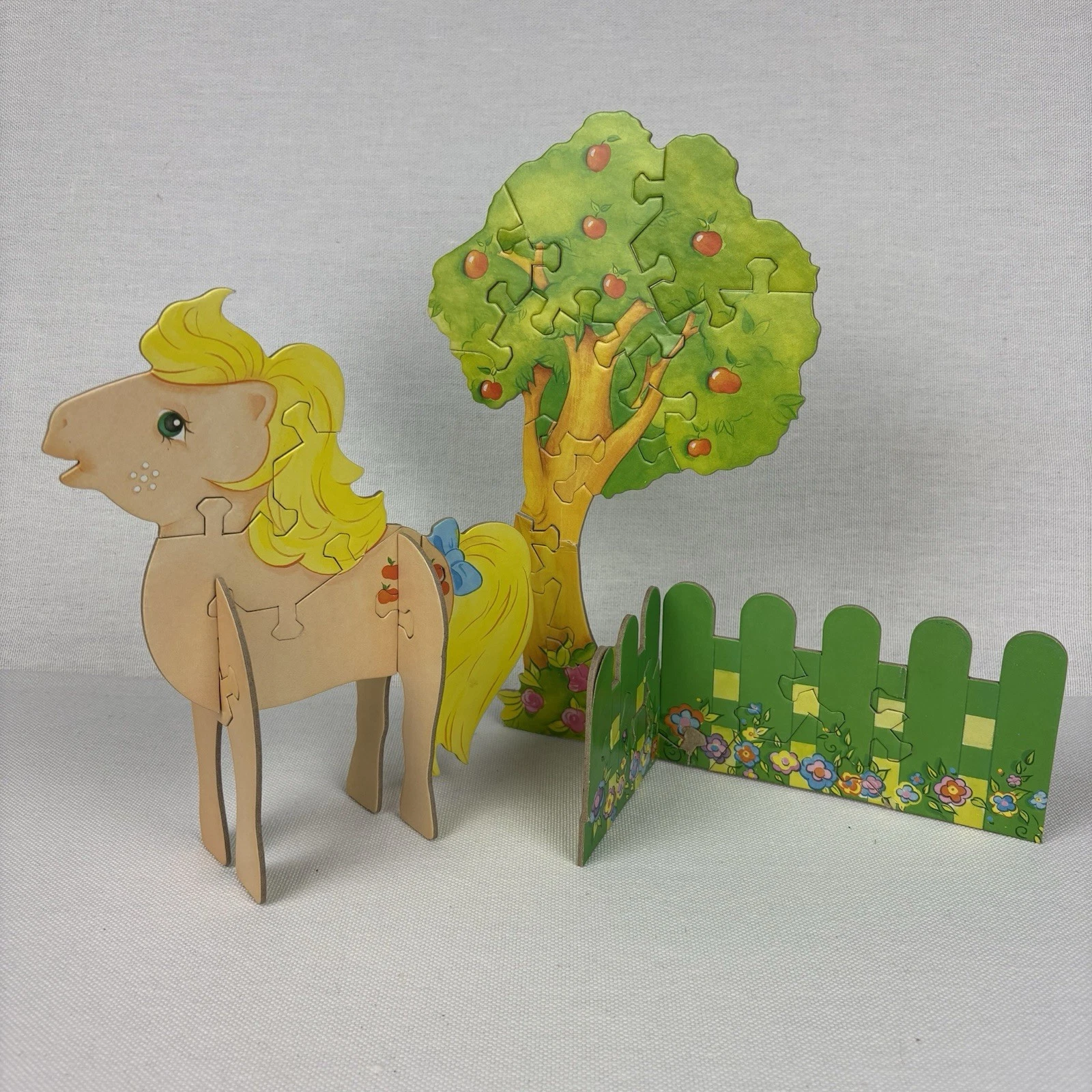 The puzzle focuses on Applejack, but Medley, Peachy, Blossom, and Twinkles are in the background. The Show Stable is featured