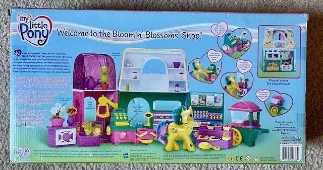 Backcard: No one in PONYVILLE loves flowers more then MEADOWBROOK! She grows all kinds of blooms in her greenhouse, and sells them in her flower shop so everyone else can enjoy them, too! When ponies come to her shop to buy yummy treats, MEADOWBROOK puts a pretty flower into their baskets! She can't decide which kind of flower is her favorite, because she loves them all!