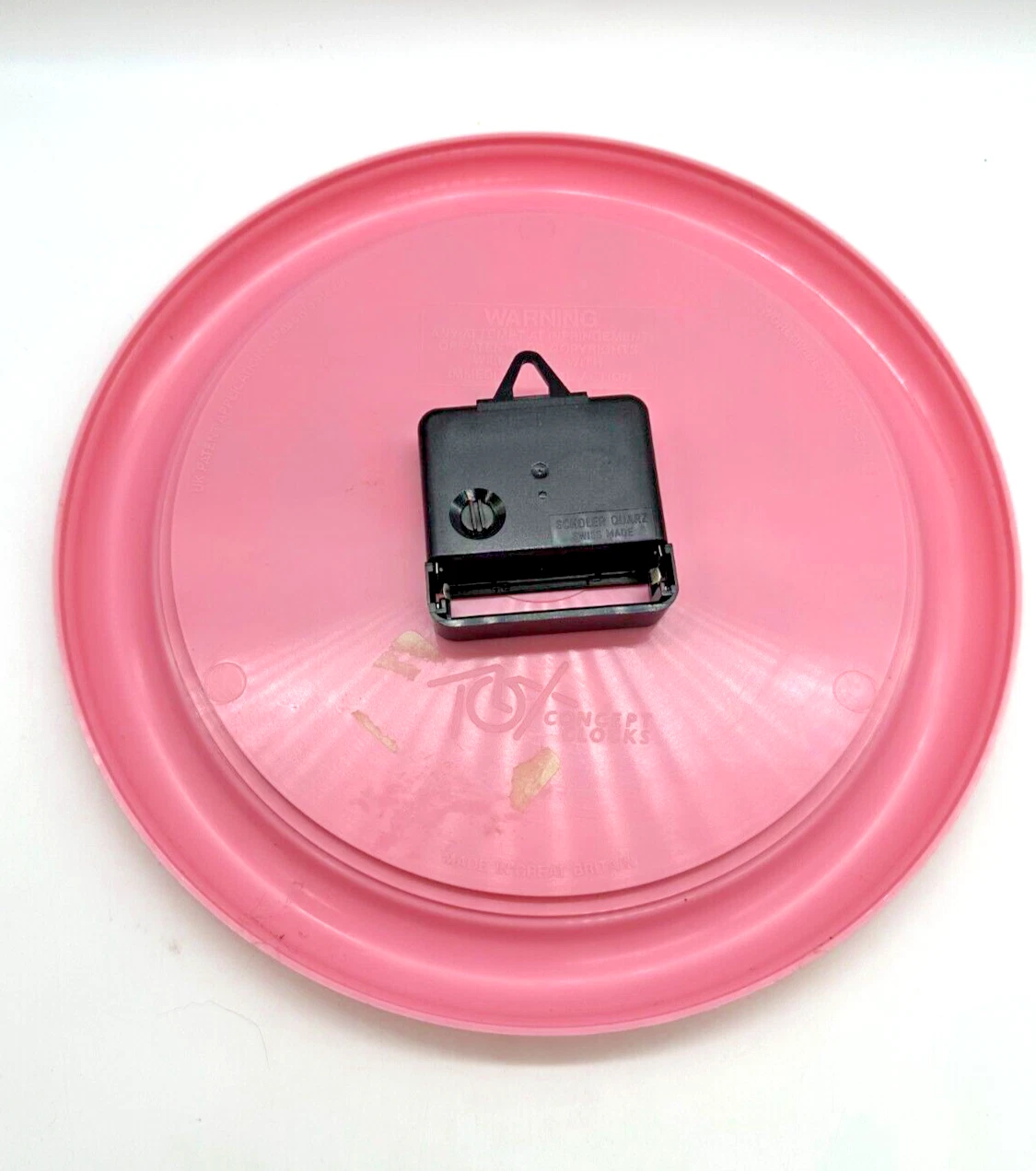 Plastic clock with a reversable clock face that features Blossom and Baby Blossom on one side, and Peachy on the other