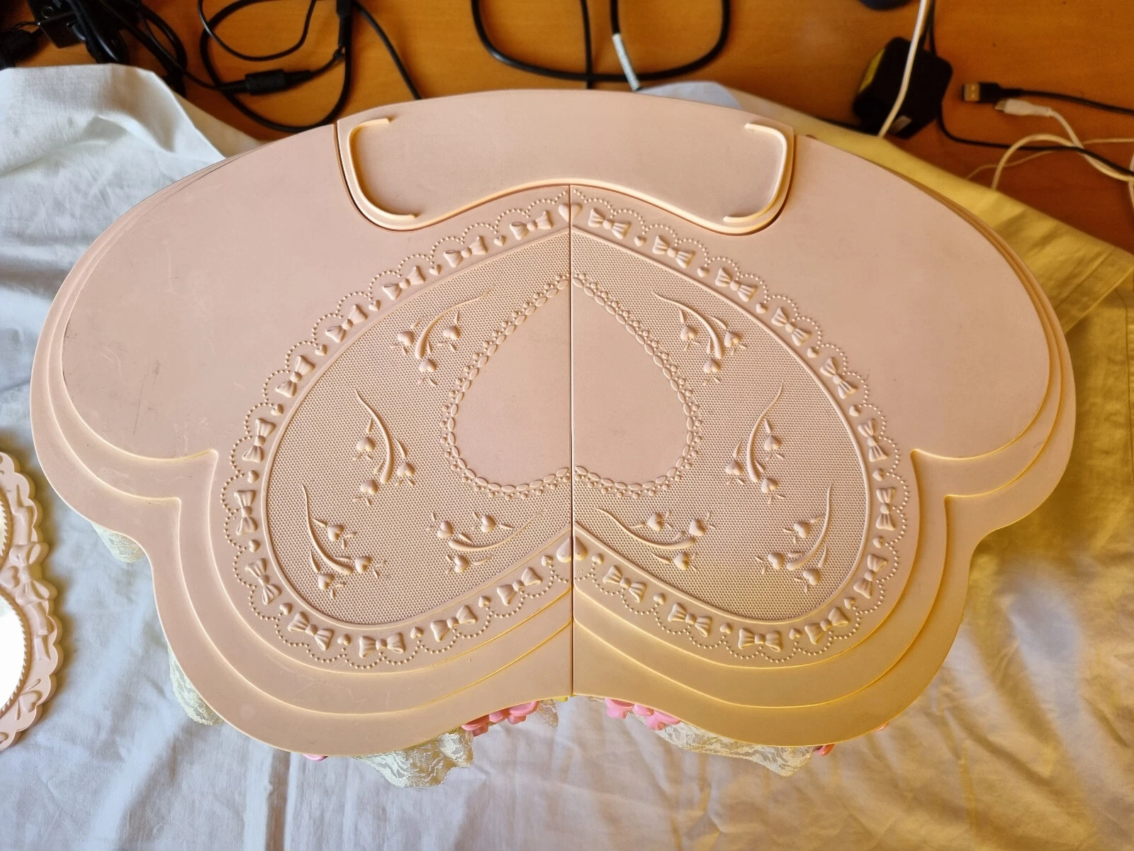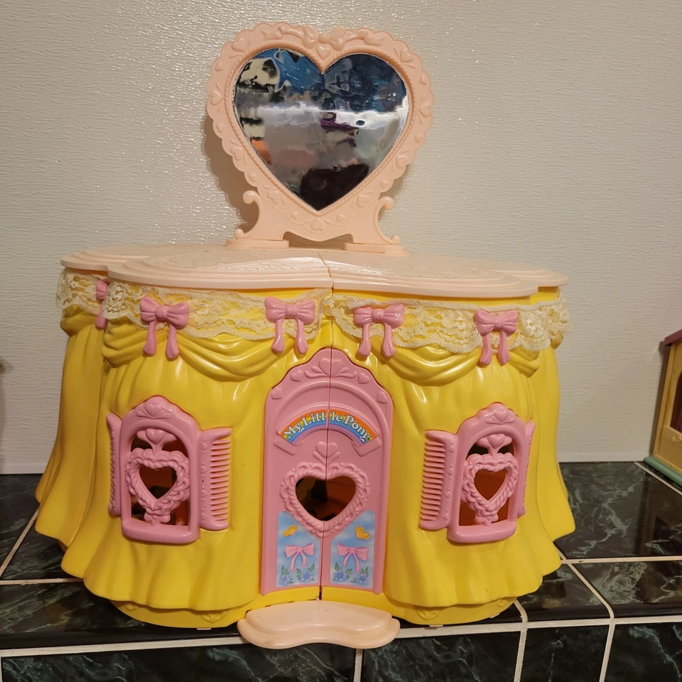 The play set is meant to look like a vanity, with a table surface and a mirror on top. It opens up to reveal a boutique/hair salon