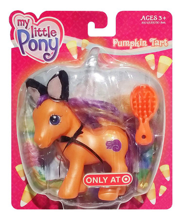 There were three sets of Halloween Pony releases, each including 2 ponies, both dressed up in Halloween costumes. Pumpkin Tart is from the first set, which is more overtly Halloween-y than the others (Including Pumpkin Tart along with Abra-ca-dabra, who is dressed a witch, whereas the later costumes include costumes like a fairy and flower, and include ponies that don't have Halloween-themed designs)