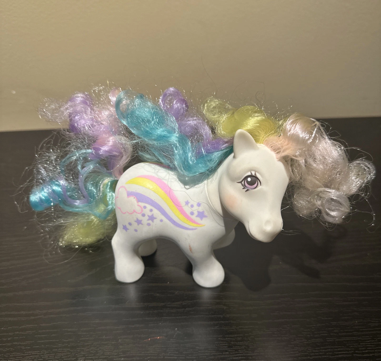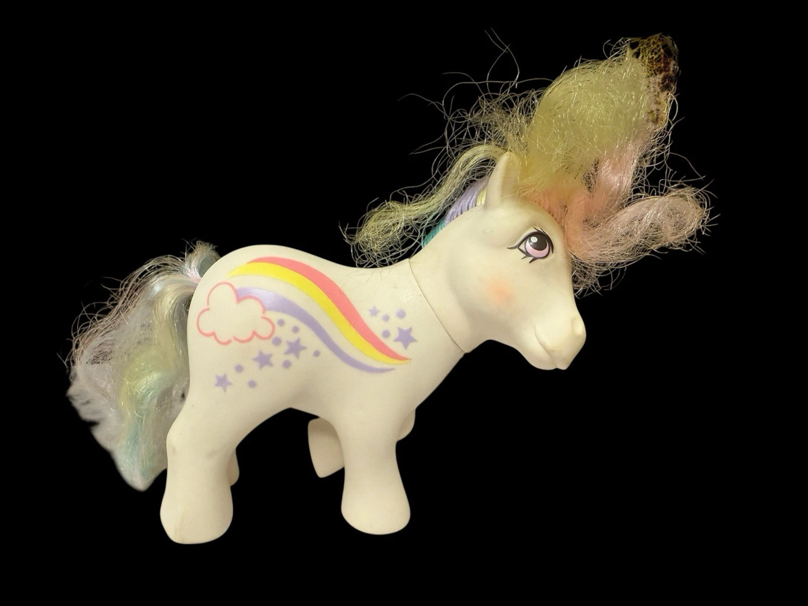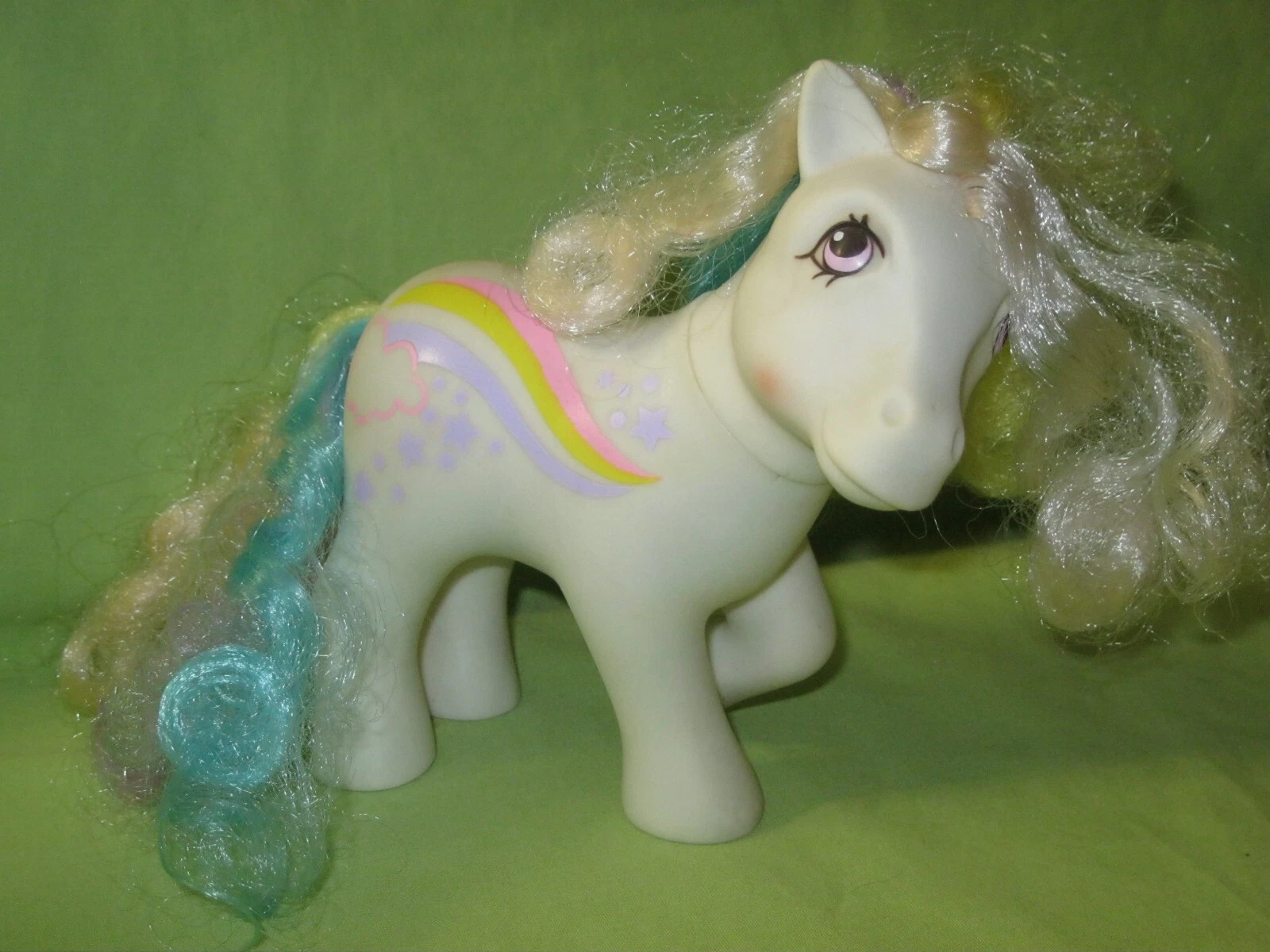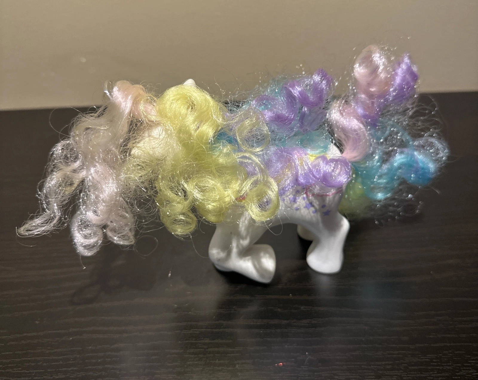 A Rainbow Curl Pony - these ponies had longer hair with fuller, tight curls, and cutie marks that stretched across their bodies, and sometimes additional decals