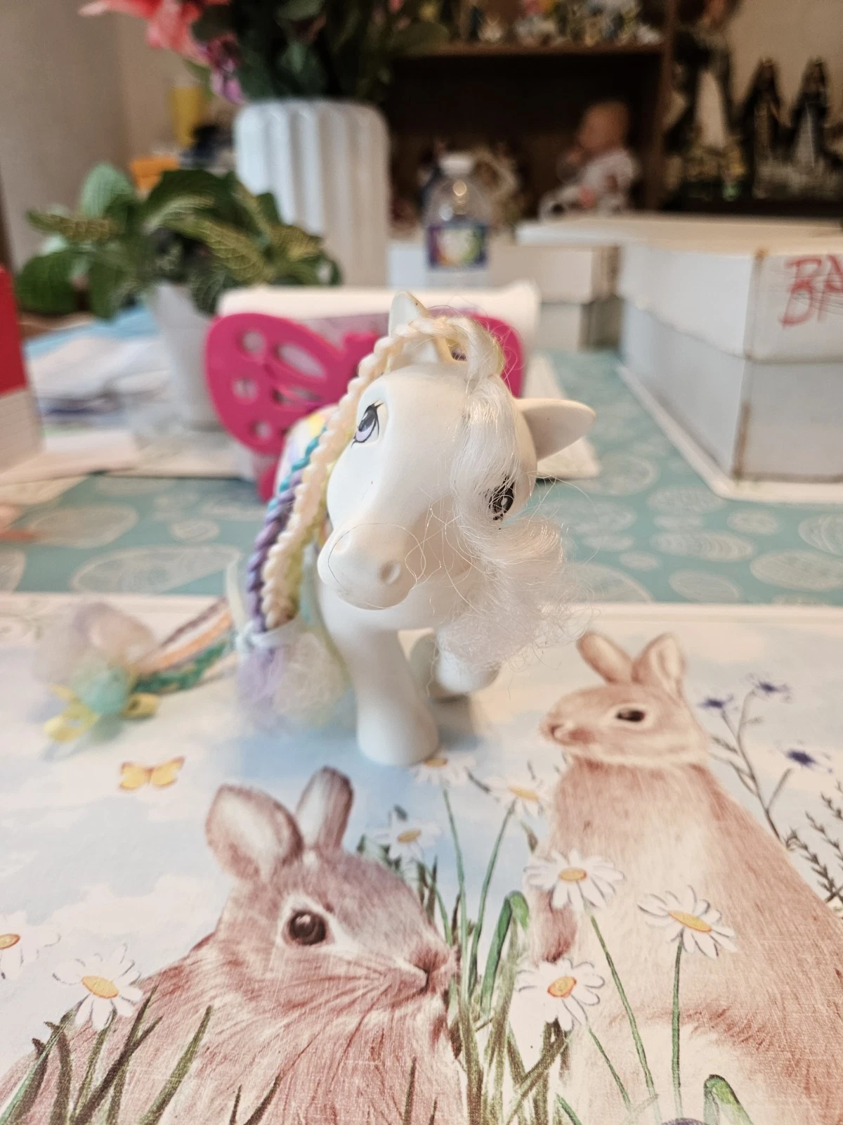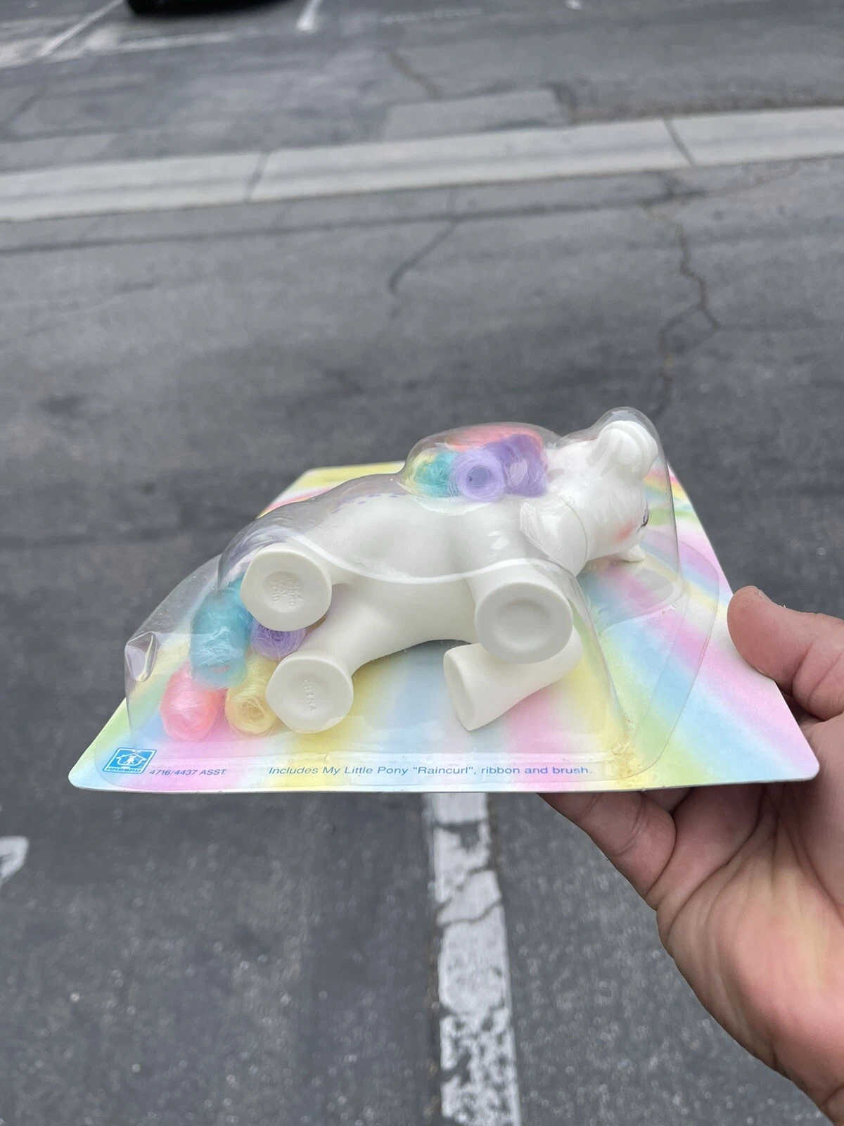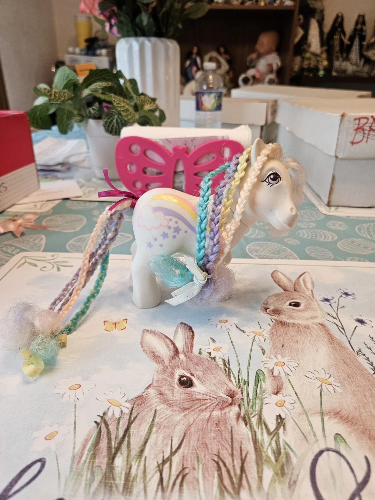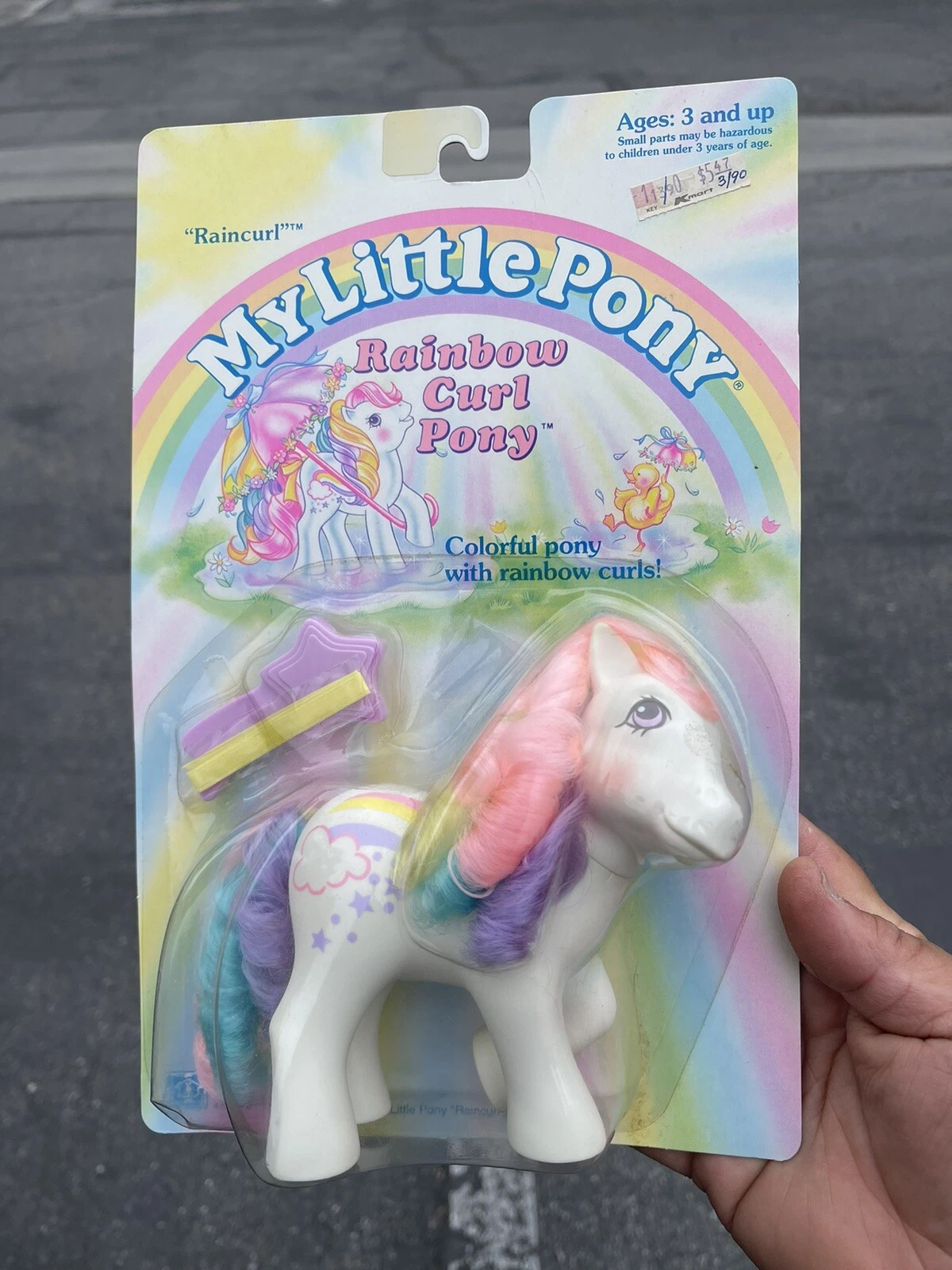 A Rainbow Curl Pony - these ponies had longer hair with fuller, tight curls, and cutie marks that stretched across their bodies, and sometimes additional decals