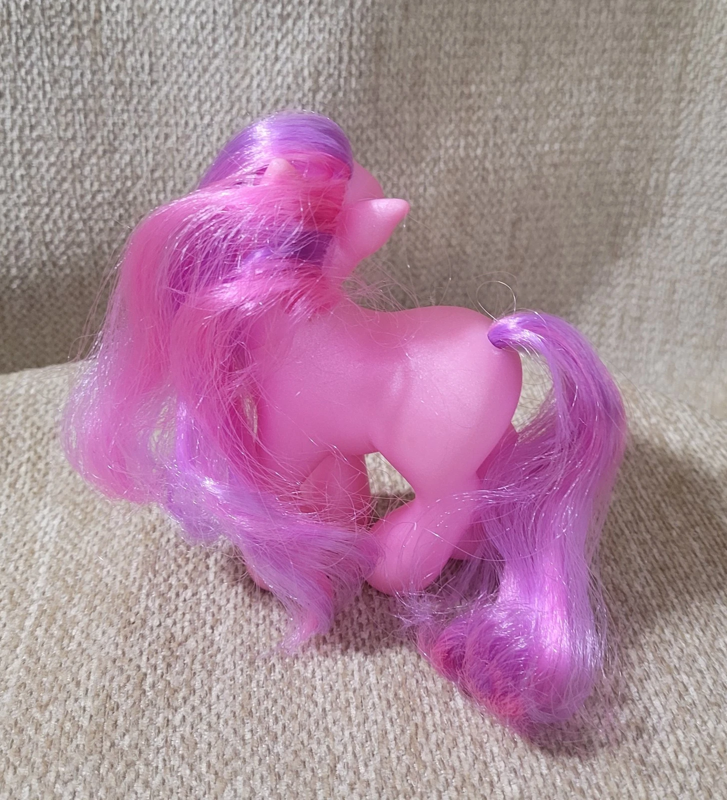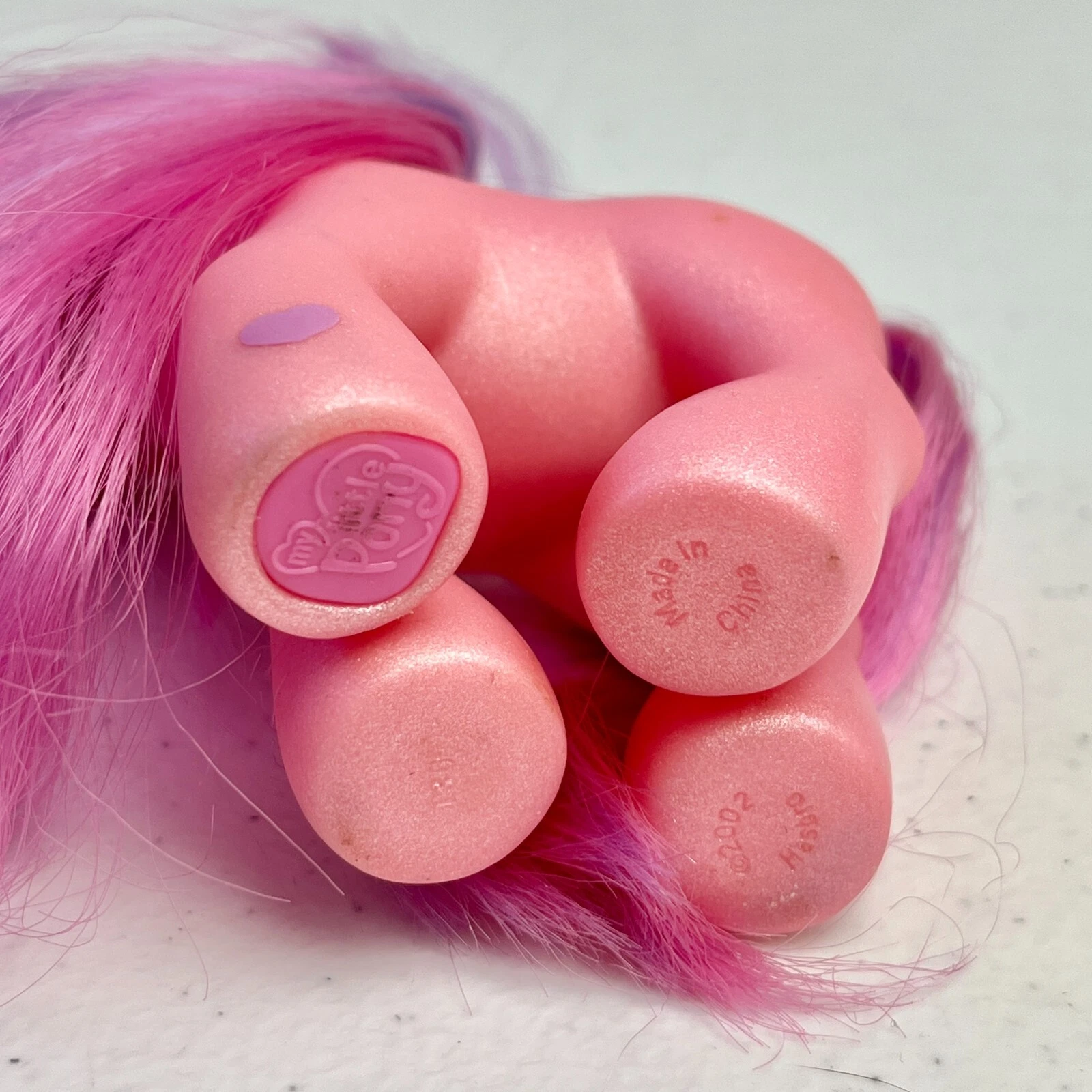 This release also has some variation. She has four stripes in her hair instead of six, the outline of her cutie mark is purple instead of pink, and her fur color is darker and less saturated. She also has a more matte body than her first release.