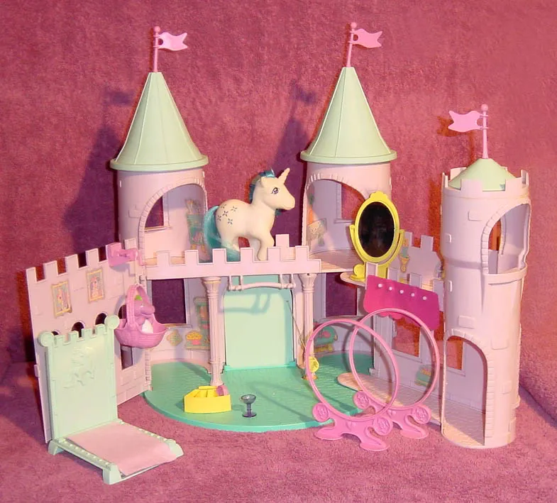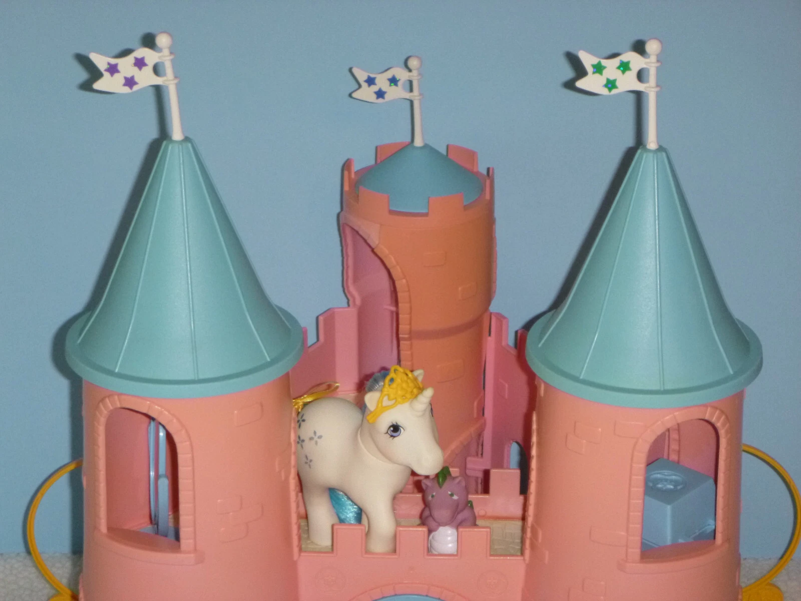 He was then featured in the Second Edition Dream Castle Play Set in 1989 ("Lavender Dream Castle" - this version of him has brighter, more saturated colors than the other two, but the same eyes as the original Dream Castle Spike